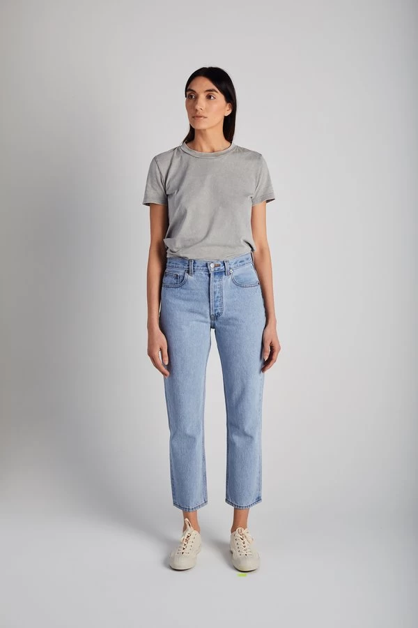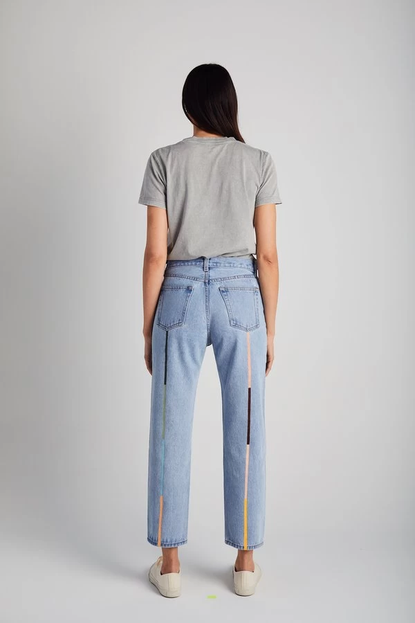 The Cloud Rainbow Tate features the signature hand-painted stripes in a delicate form. This third generation rainbow style features pastel colors inspired by sky tones. The Tate is Still Here’s classic vintage style jean. It’s a straight leg, hi-rise, crop wedgie fit with a detailed focus on lifting and flattering. It’s the perfect everyday jean.Â