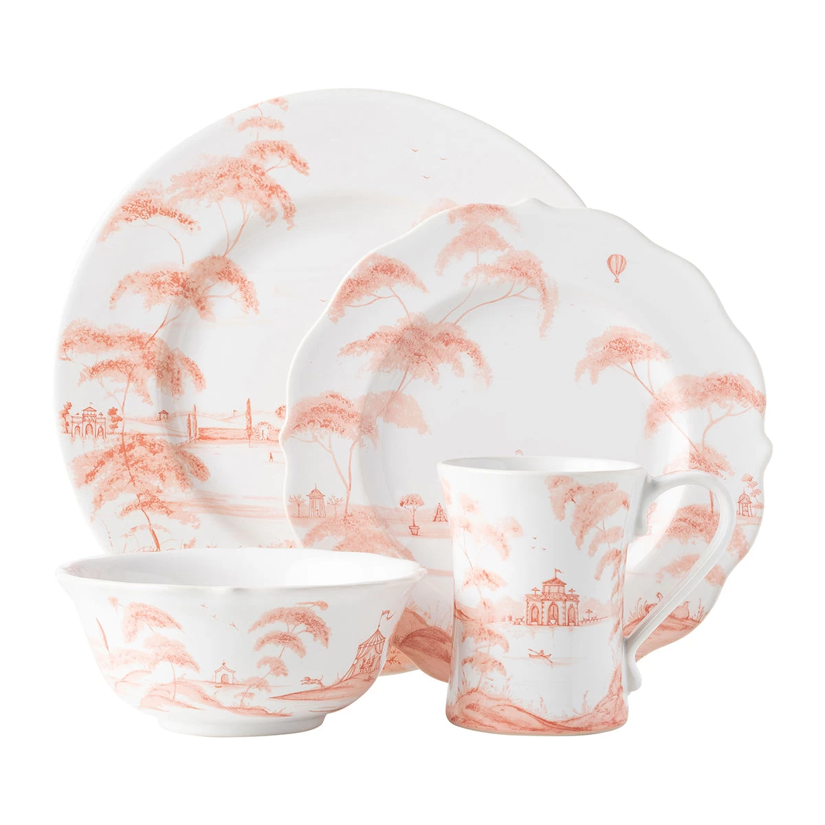 From our Country Estate Collection- Featuring narratives of the English Countryside, our 4 piece setting in petal pink contains a dinner plate, dessert/salad plate, cereal/ice cream bowl and mug.Â