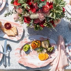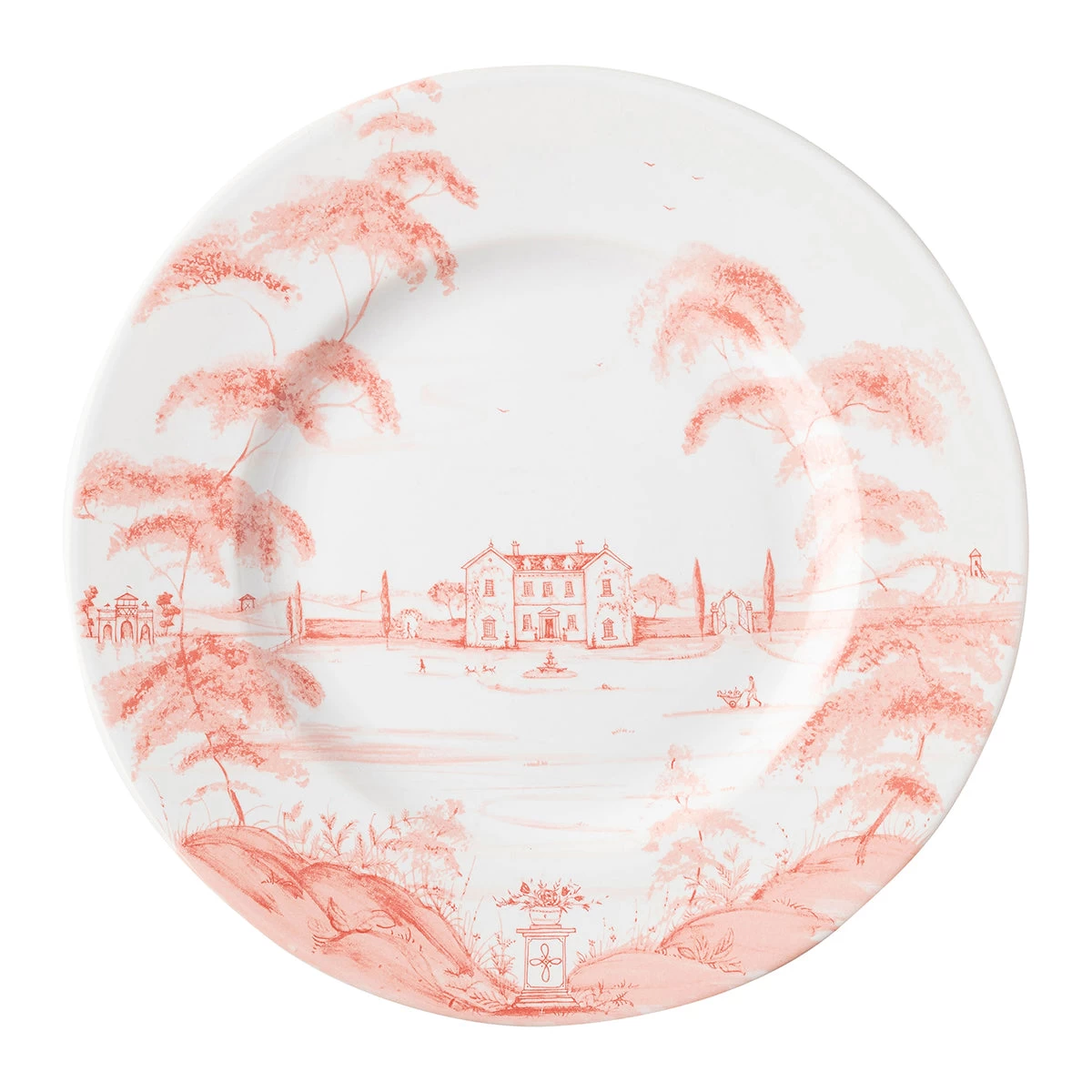 From our Country Estate Collection in irresistibly pretty pink- Welcome to the main house, where friends and family have gathered for generations and country food is raised to a point of fine art. A feast for the eyes and table, our stately dinner plate is a portrait of the inviting and bustling life you can explore on the estate and where you can always find something delectable bubbling away in the kitchen. Featuring: The Main House, Boathouse, and Apple Orchard.