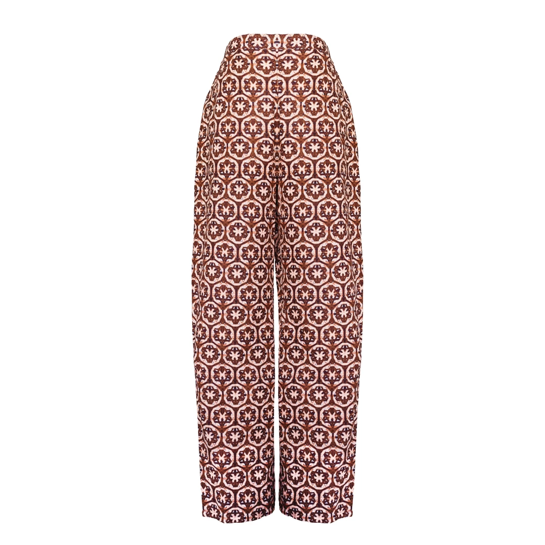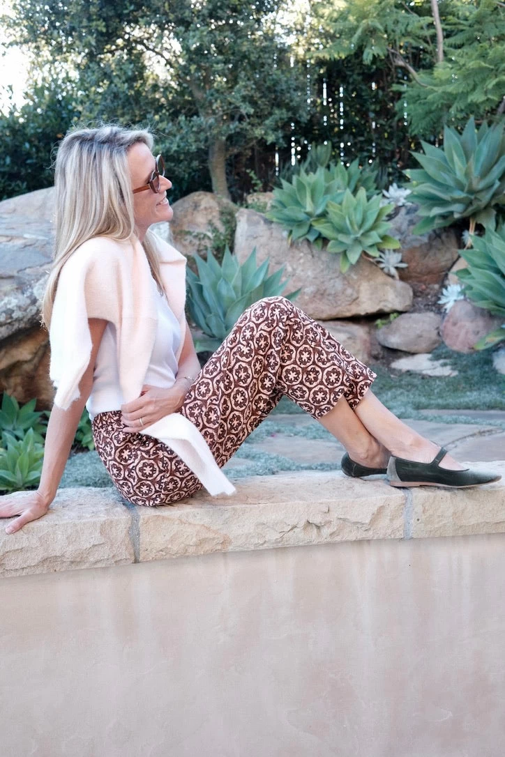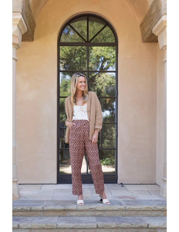 Designed to seamlessly work into your wardrobe for the in-between seasons of summer and fall, our lattice print will by your style stalwart for September and beyond. The unexpected color combination of warm pink and rich chocolate marries beautifully on this geometric design, a welcome departure from florals. In different scales for contrast, the pieces are designed to be worn together or paired with your go-to lightweight cardigan, slouchy denim or silver flats. This pull-on pant, with its elasticized back, pulls on easily and effortlessly for busy fall days and back-to-school season when denim won’t do.