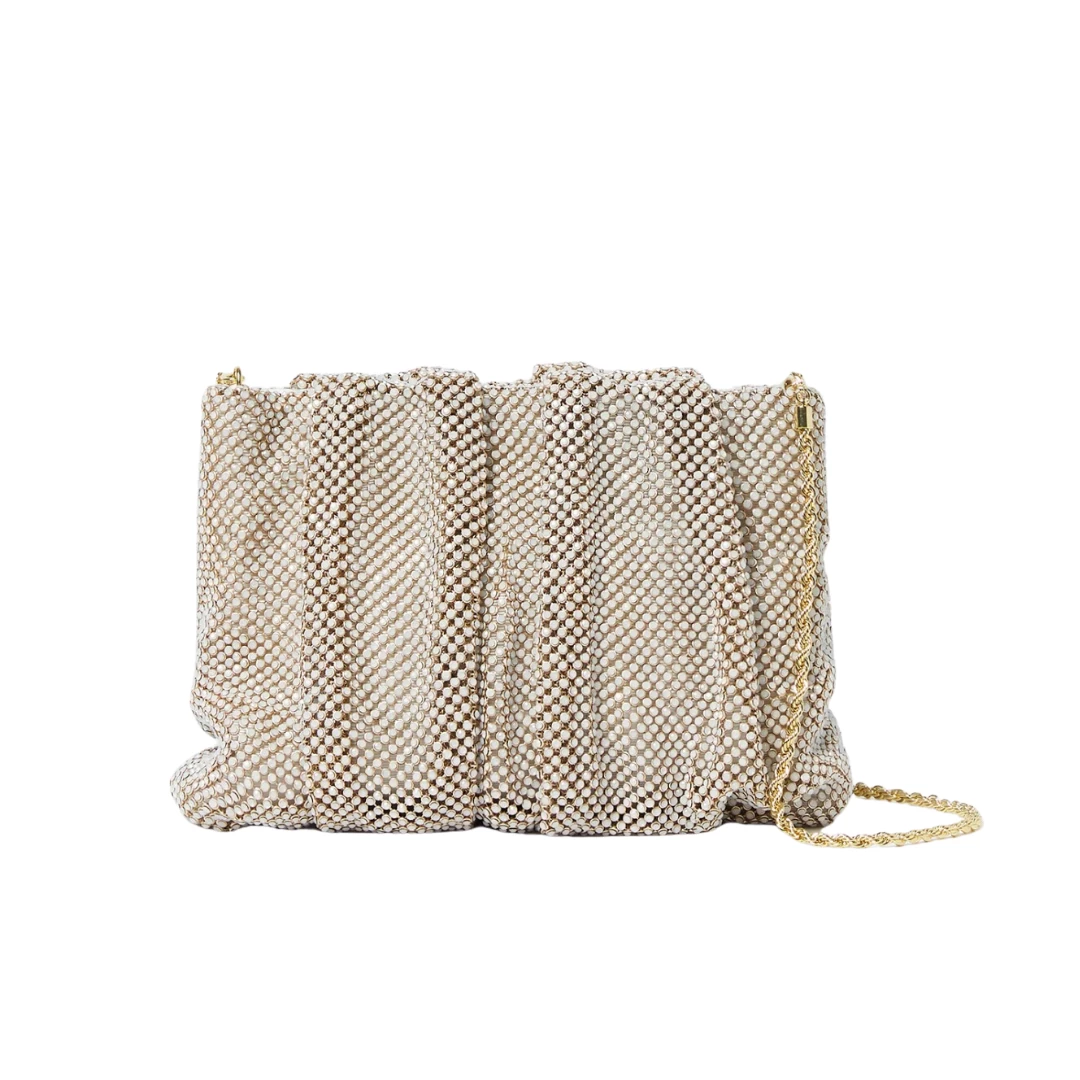 Gathered flat clutch in opal diamanté mesh. Features a removable twisted gold metal chain strap, frame closure, full lining, and an interior slip pocket.