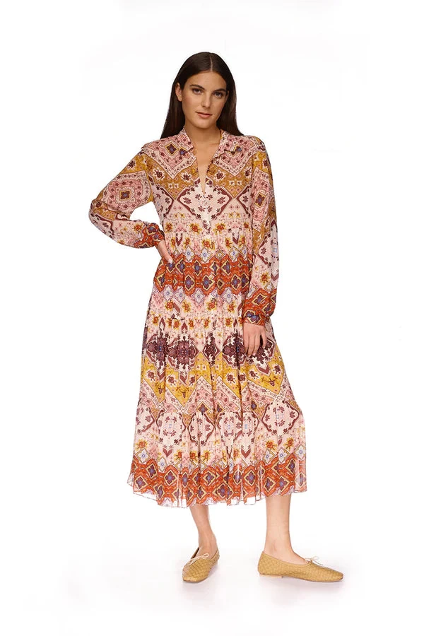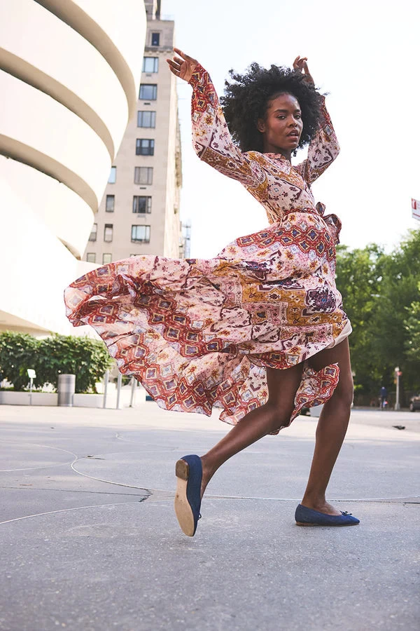 The Lolan Dress reimagines the shirtdress in an intricate, geometric print inspired by interior design. Cascading tiers start at the waist adding a structural spin to this classic maxi. A wide, removable sash offers styling versatility.Â