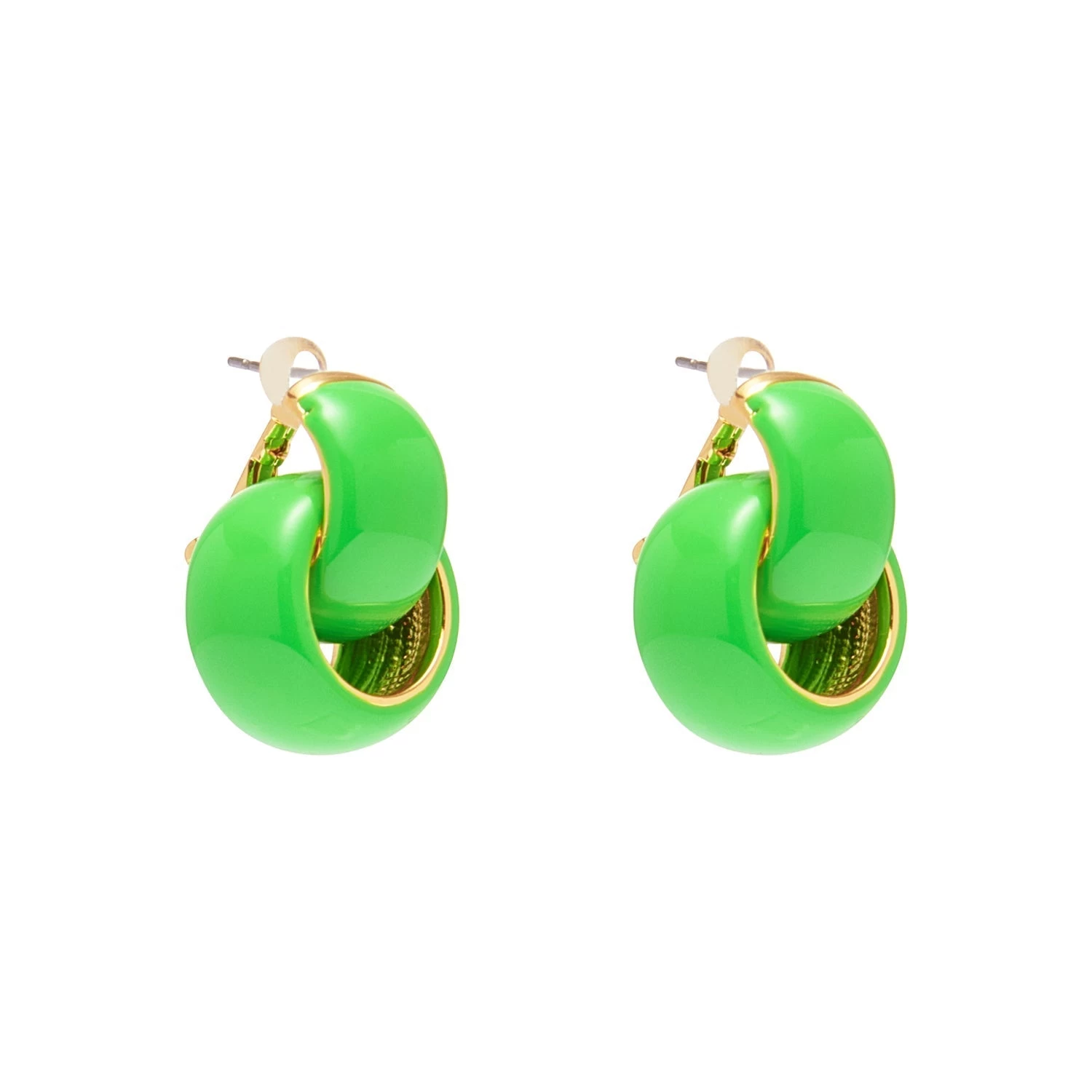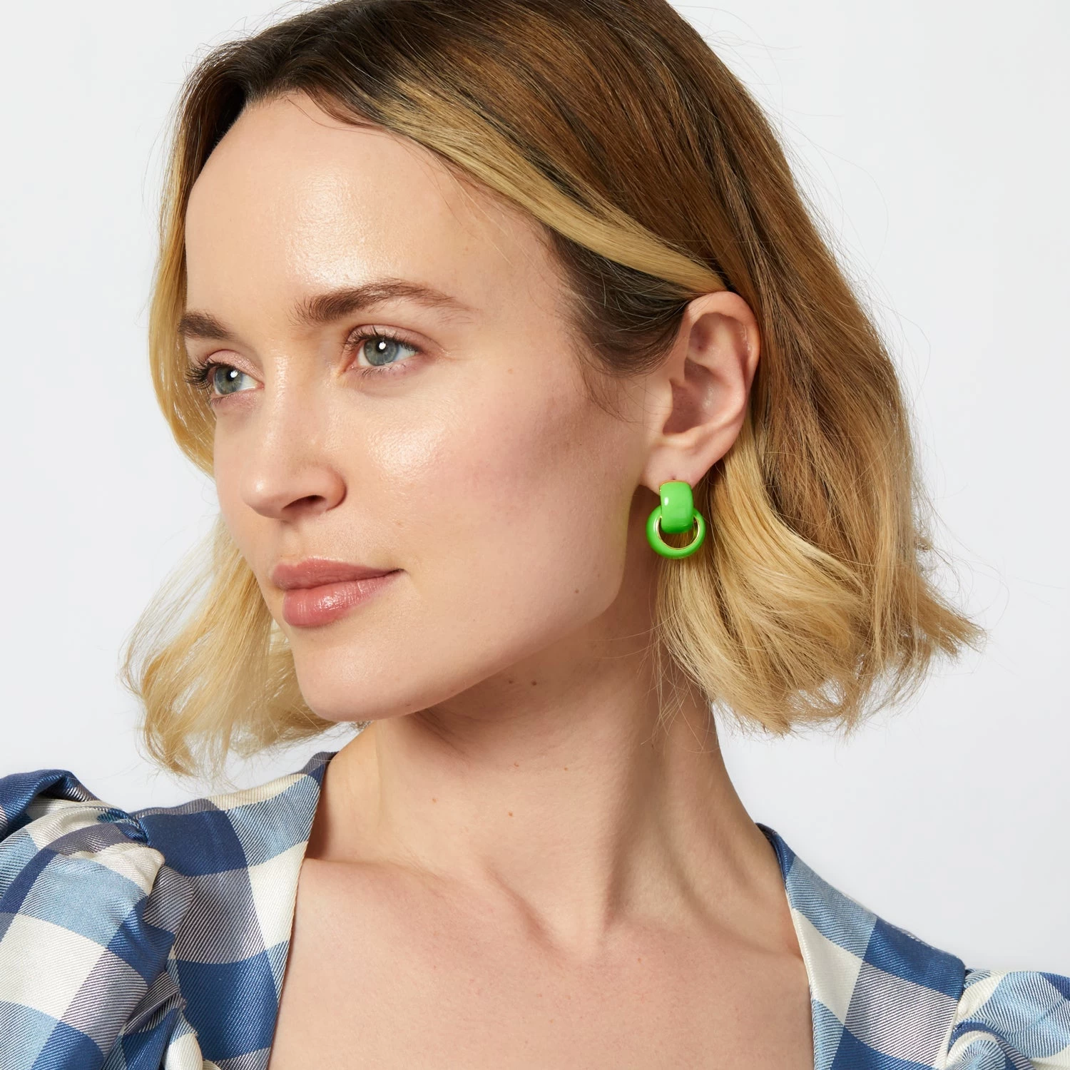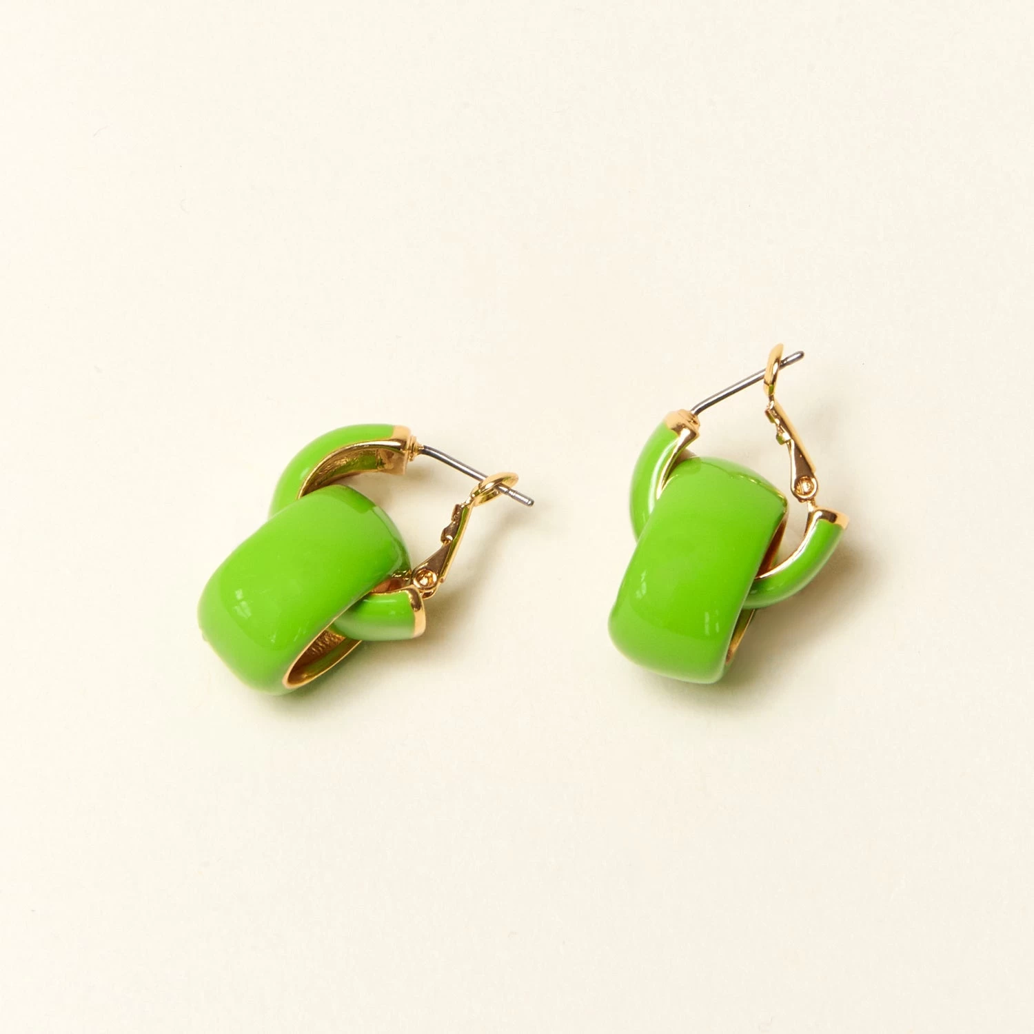 Gleaming huggie hoops, that offer two-in-one wearability, these unique hoops are made with the loveliest shade of lime green. Wear as shown or remove the bottom hoop for a smaller hoop. Inspired by sculptural ceramics from Copenhagen and the vibrant colors of Stockholm.