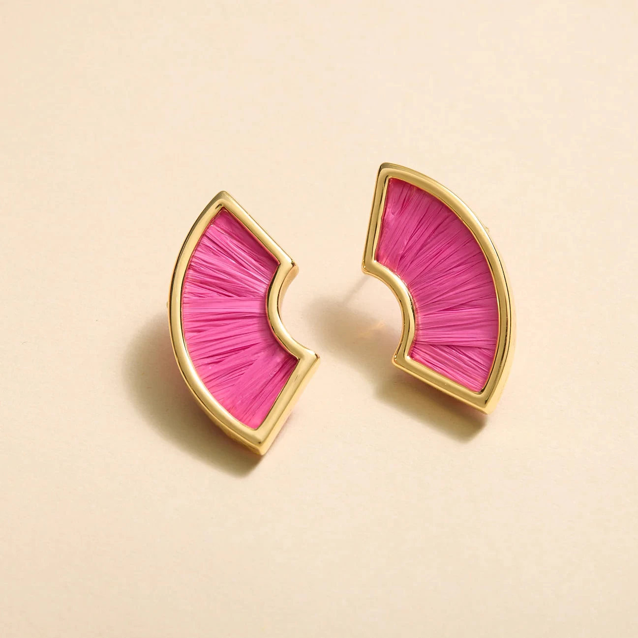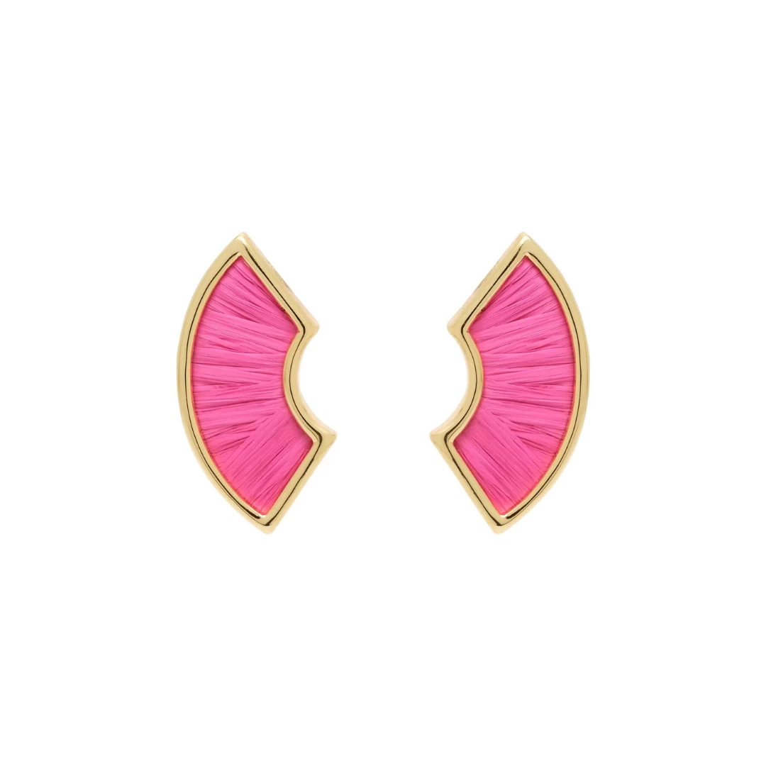 These joy-filled earrings are hand woven with textural, pink raffia. A great transitional style for summer to fall.Â
