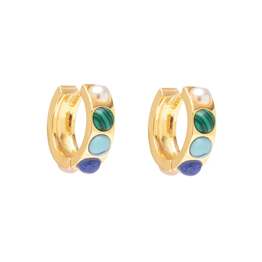 Dainty hoops with an assortment of semiprecious stones of rose quartz, turquoise, pearl, malachite, and jasper. For added MG allure, the backside of the earring features different colors and could actually be flipped around and worn backwards!Â