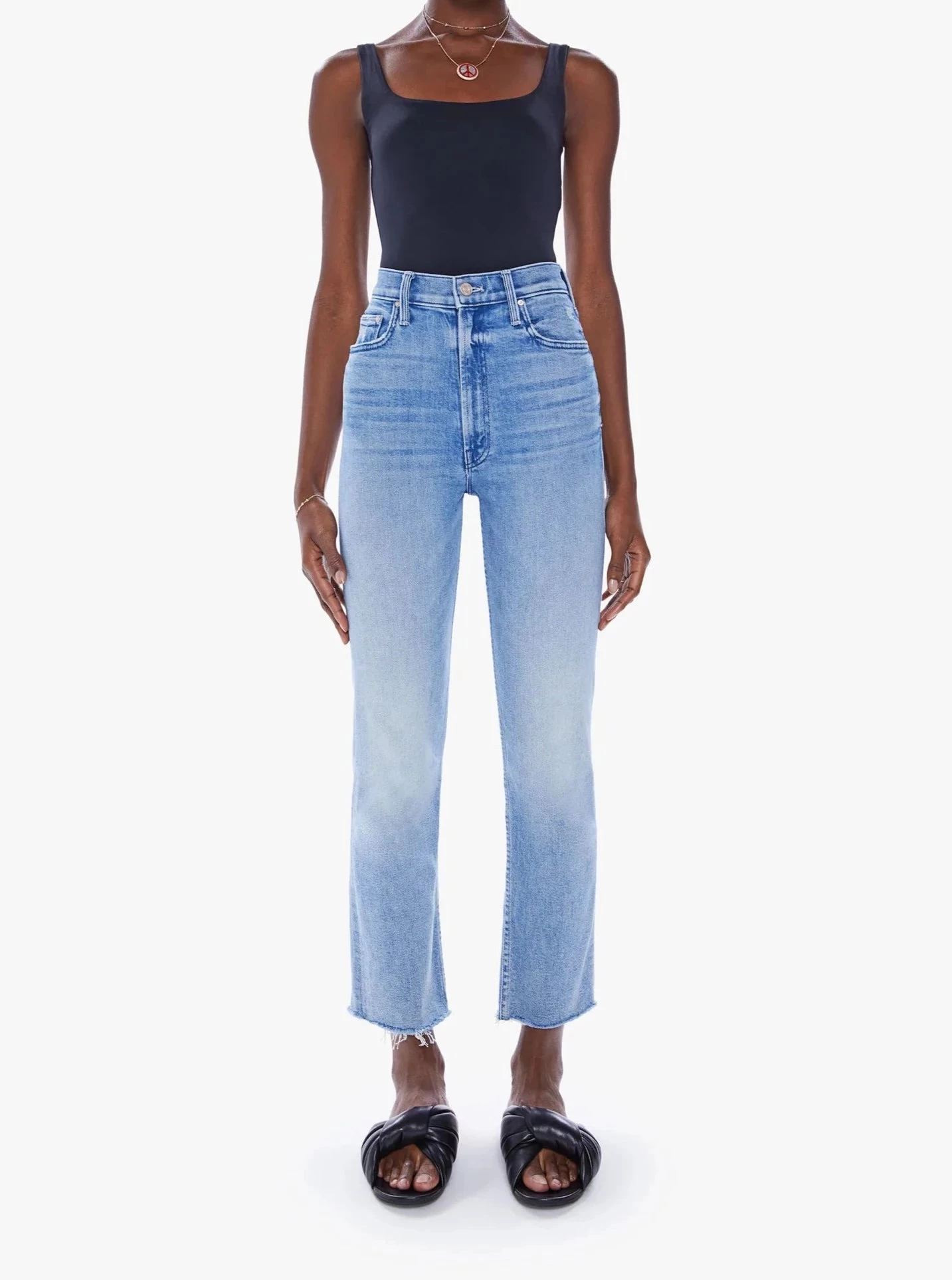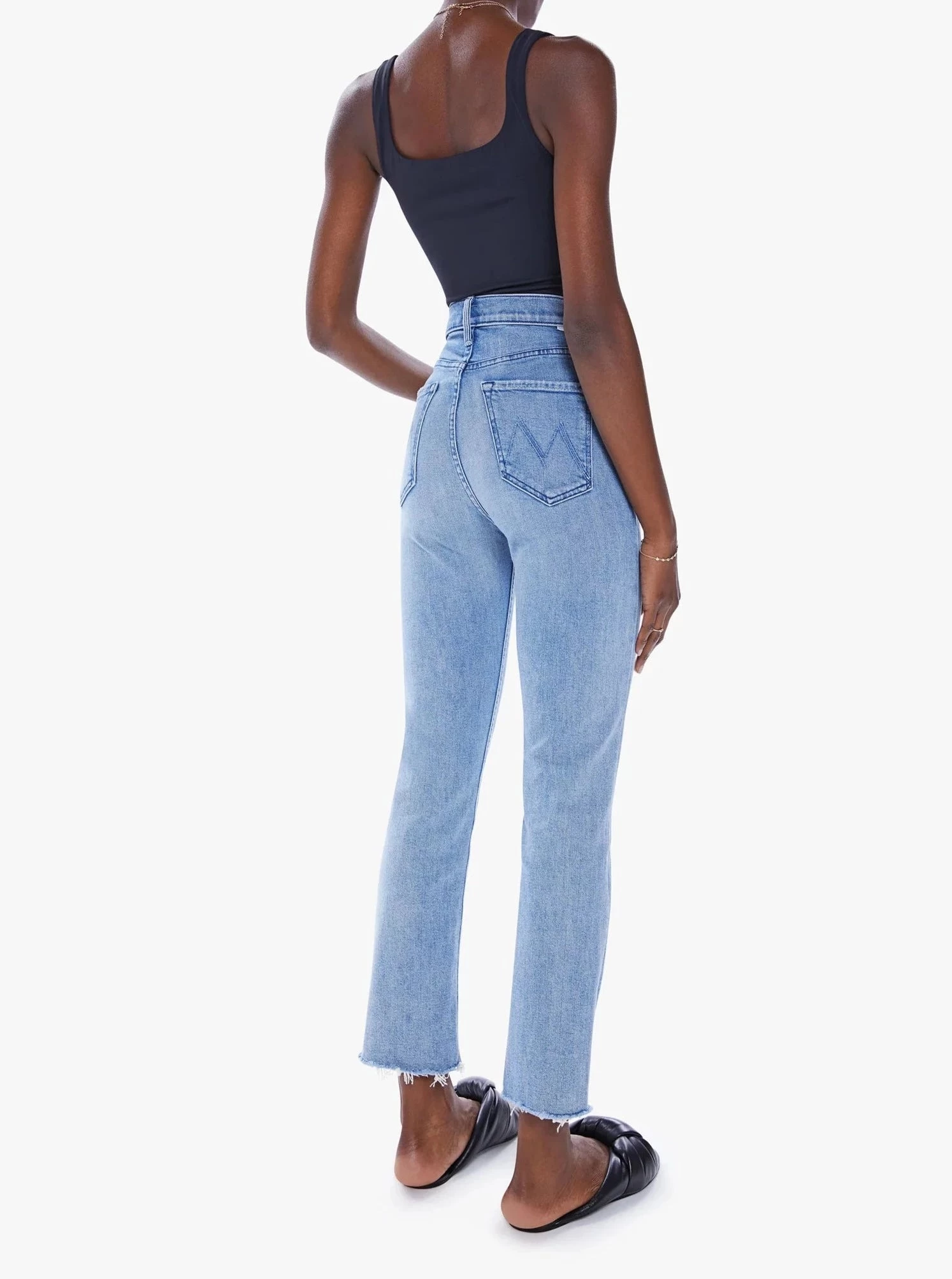 Mother Denim does it again. The perfect high-waisted straight leg with an ankle-length inseam and a frayed hem. Cut from comfortable stretch denim, Fish Out Of Water is a light blue wash with fading and whiskering.