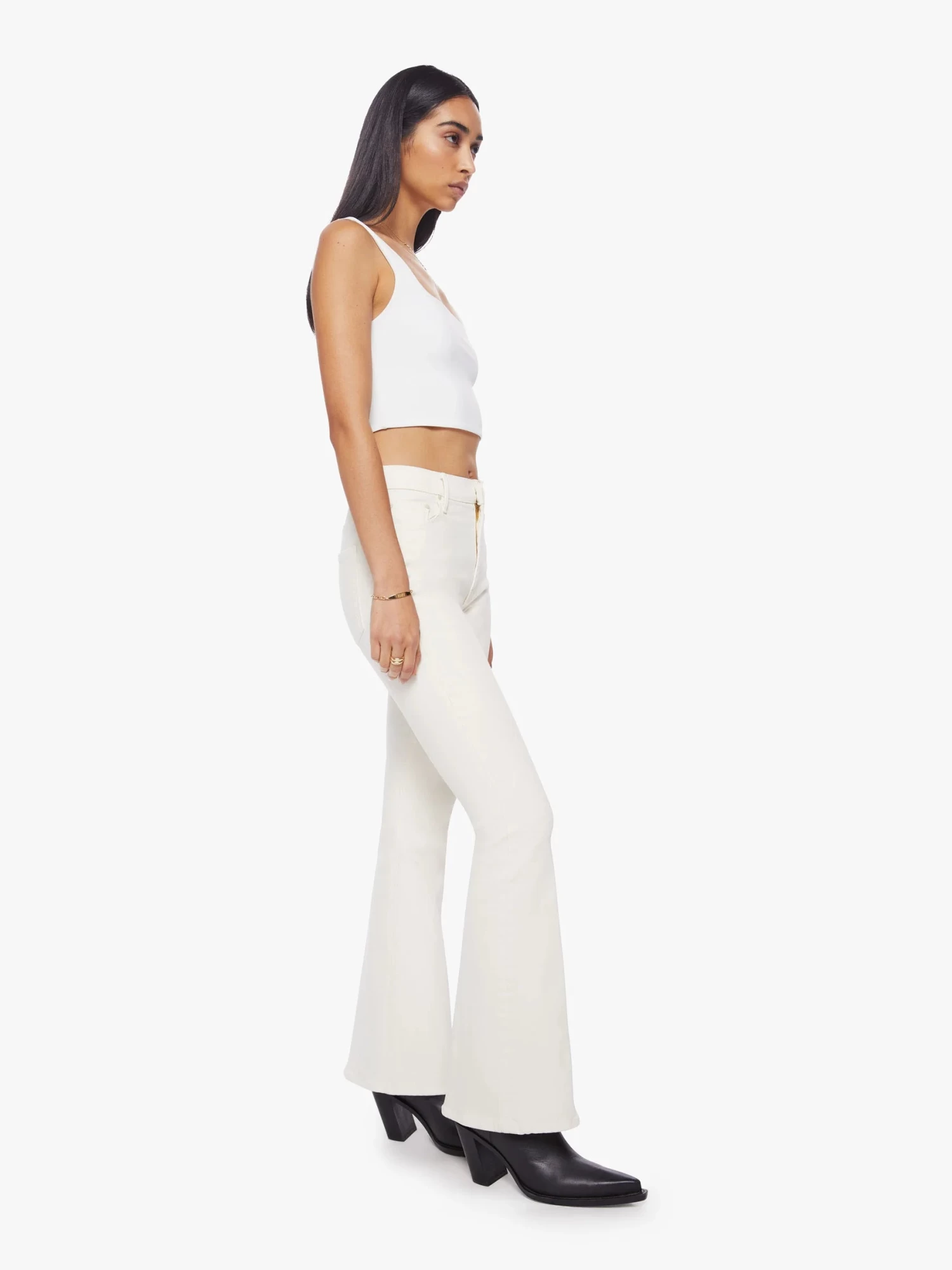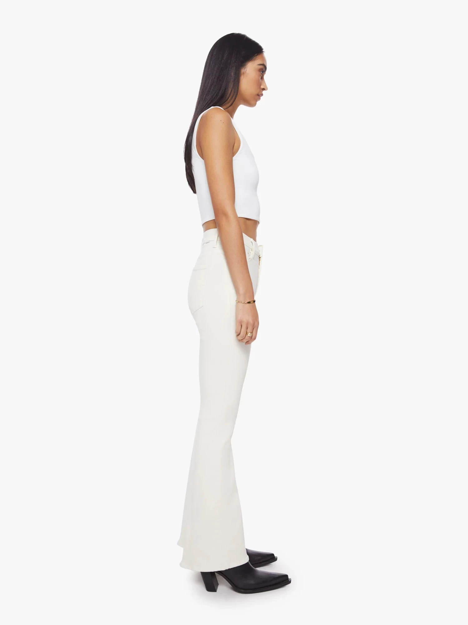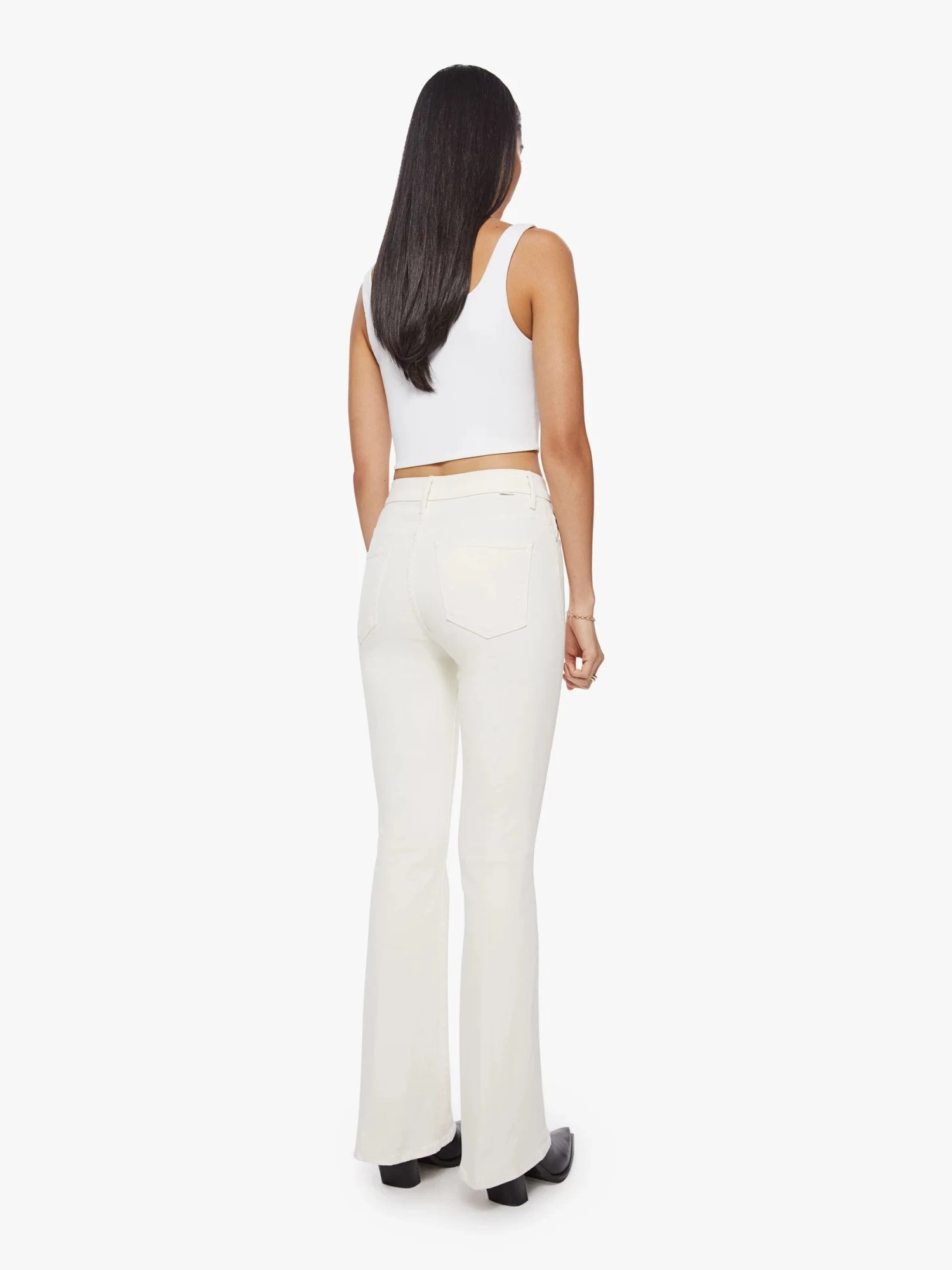 Mother Denim does it again. Love you s’more. This cult-favorite flare has a high rise, long 31-inch inseam and clean hem. Cut from a cotton blend with a touch of stretch, Marshmallow is a creamy, off-white hue with tonal hardware for a monochrome look.