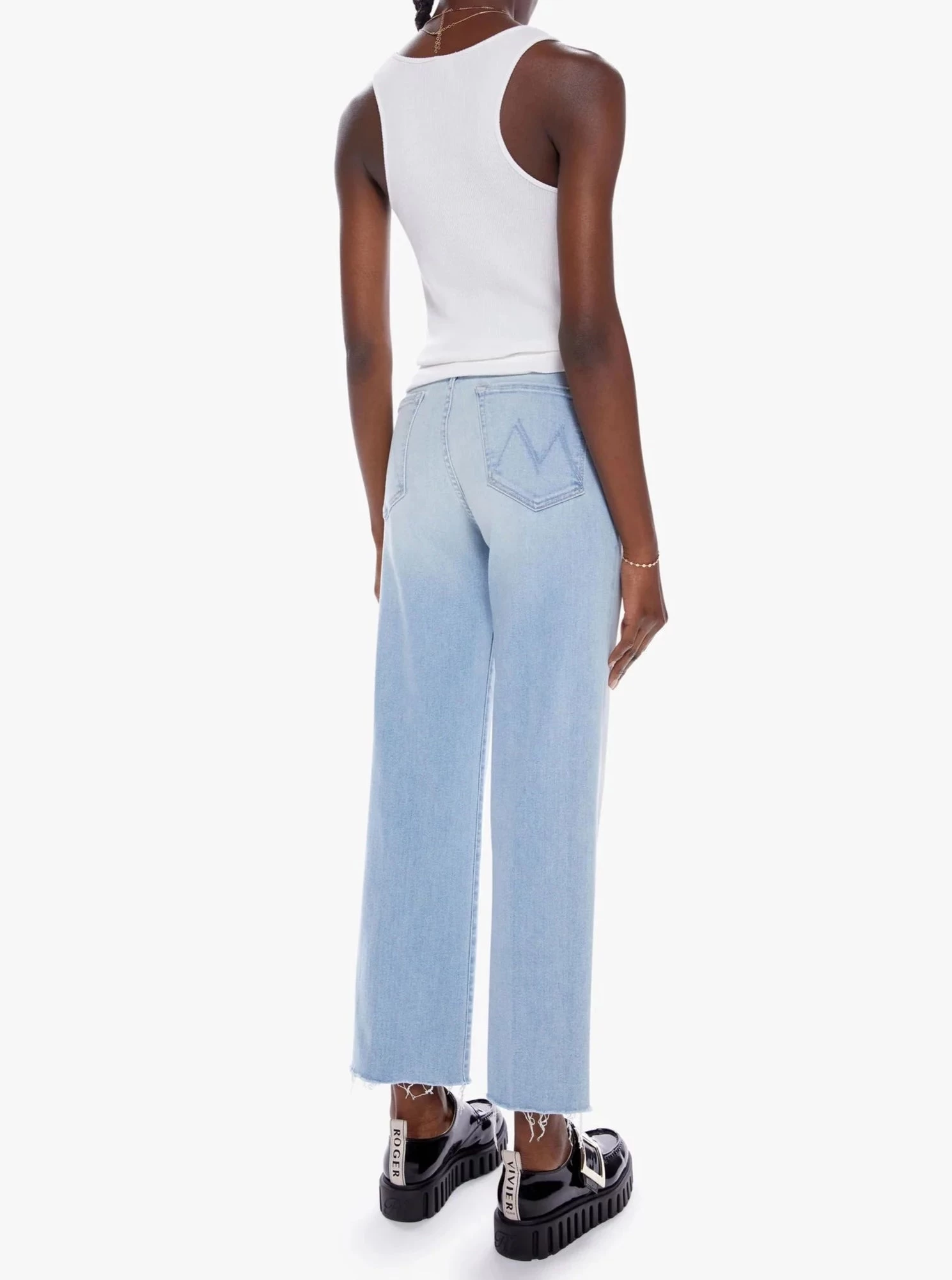 The Rambler Ankle Fray is a high-waisted straight leg with a button fly and ankle-length inseam. Crafted from denim with a touch of stretch, Chill Pill is a light blue wash with fading and whiskering.
