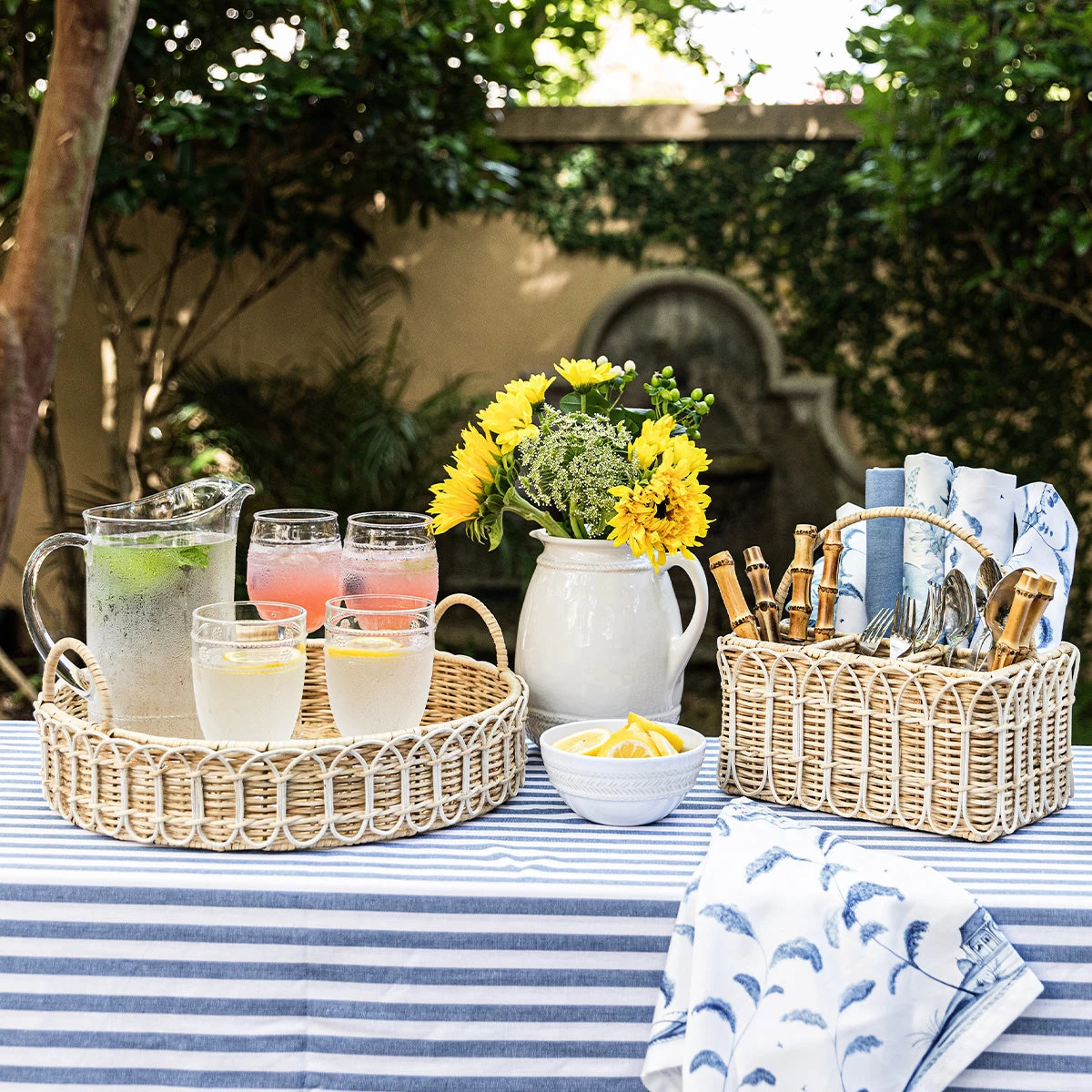 Alfresco feasts and boisterous buffets are kept tidy with this chic caddy that organizes utensils, napkins, and condiments while delivering an element of natural beauty in handwoven rattan.