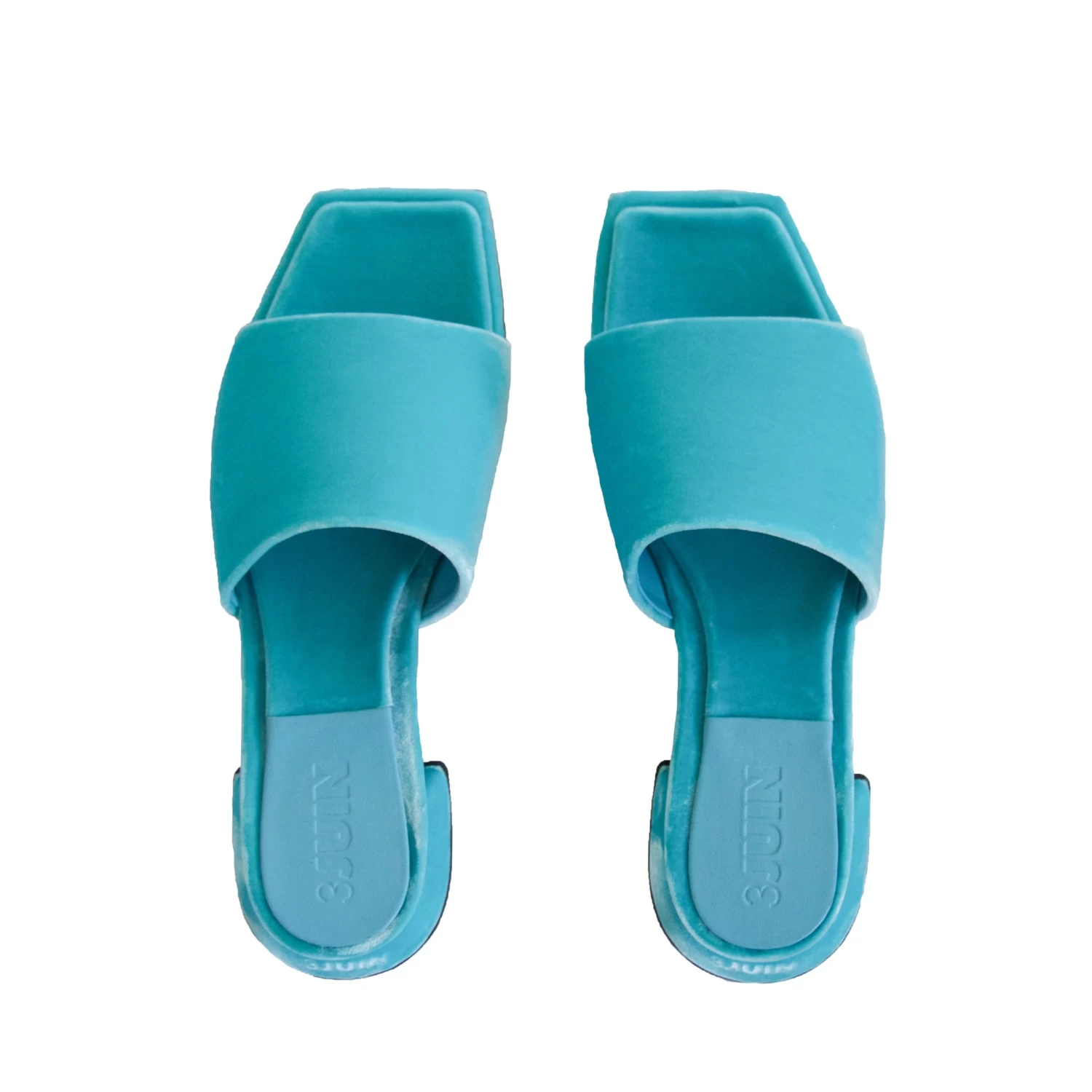 The Siena Slide is an open toe velvet sandal with a low heel and square toe.
