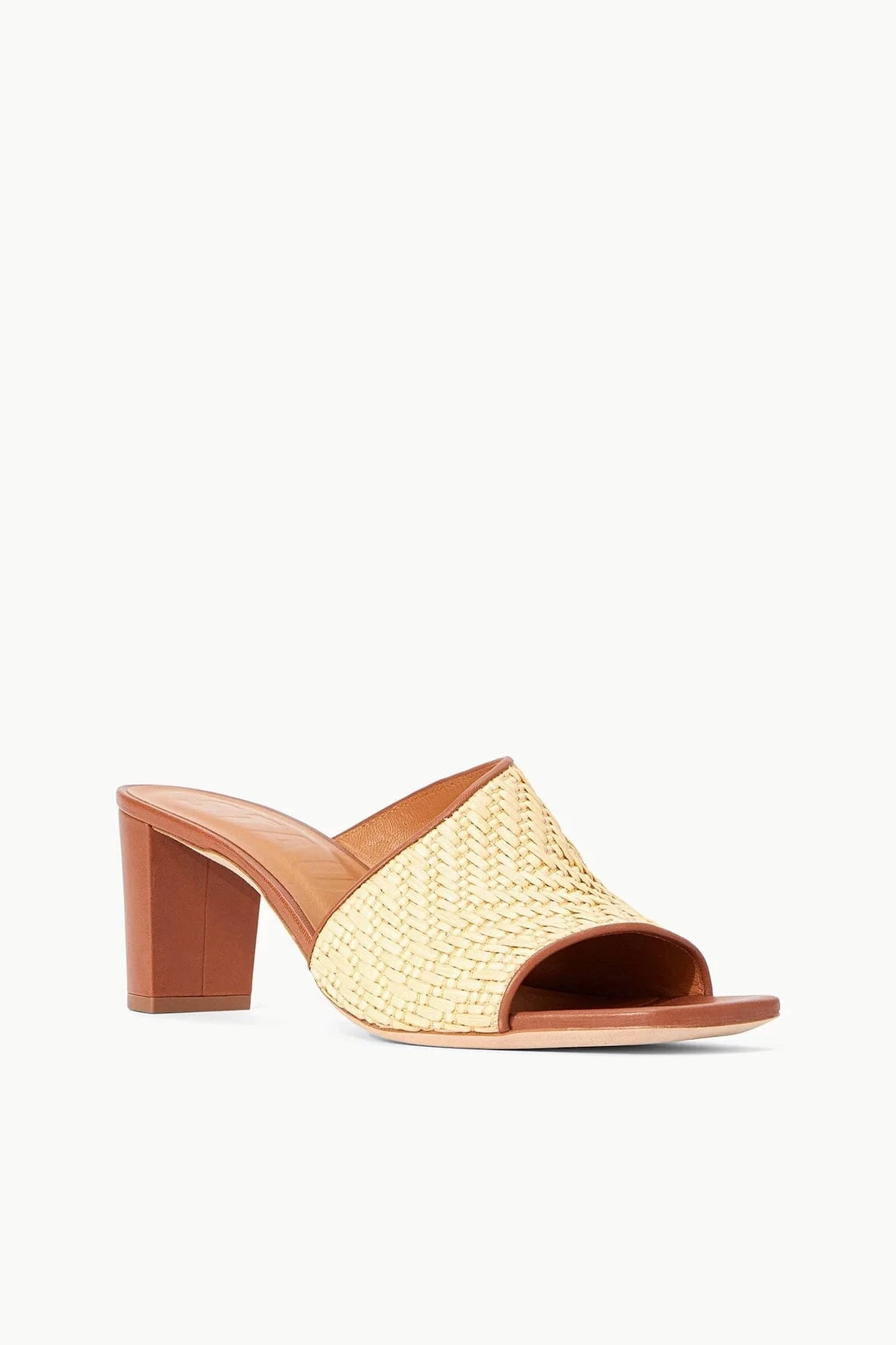 A statement heel, the Nevil Heel features an asymmetrical raffia pattern upper and contrasting leather outsole.