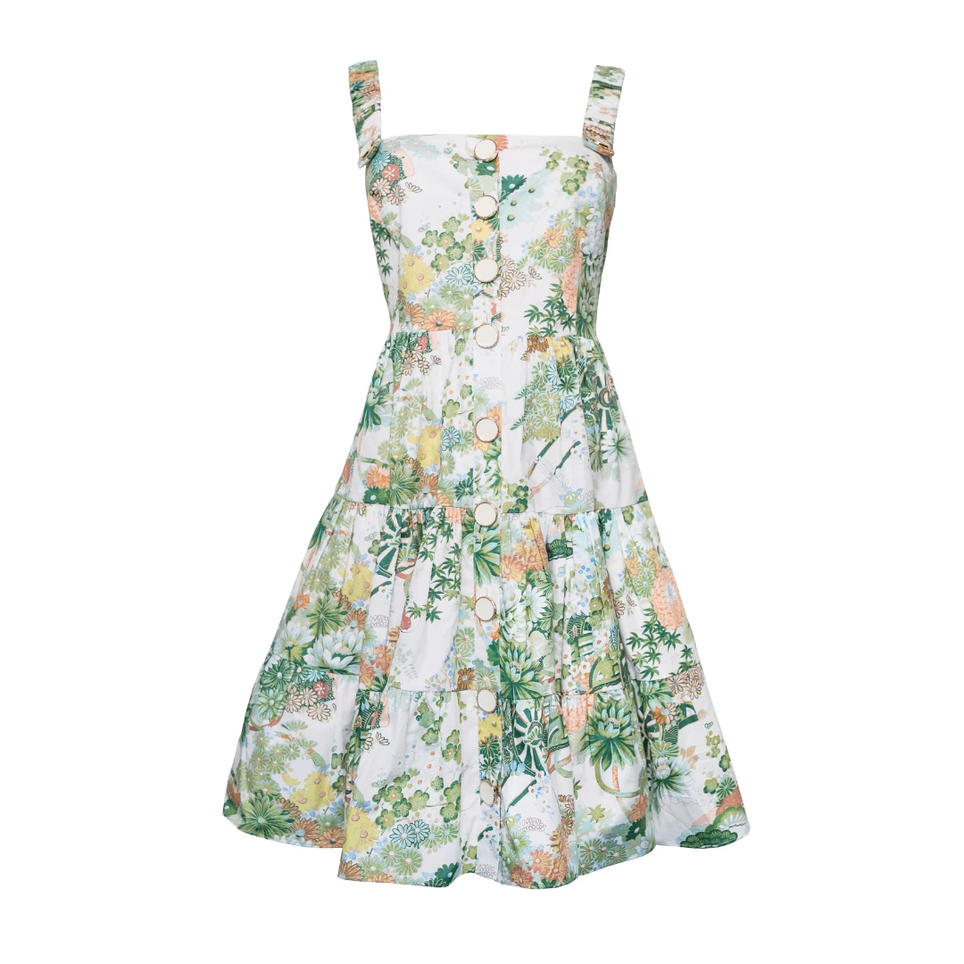 The Tiered Button Detail Dress features enamel buttons, ruched straps, and a short, tiered silhouette.Â