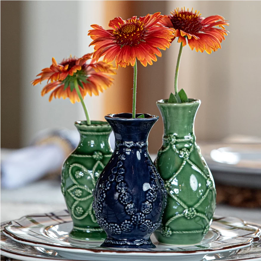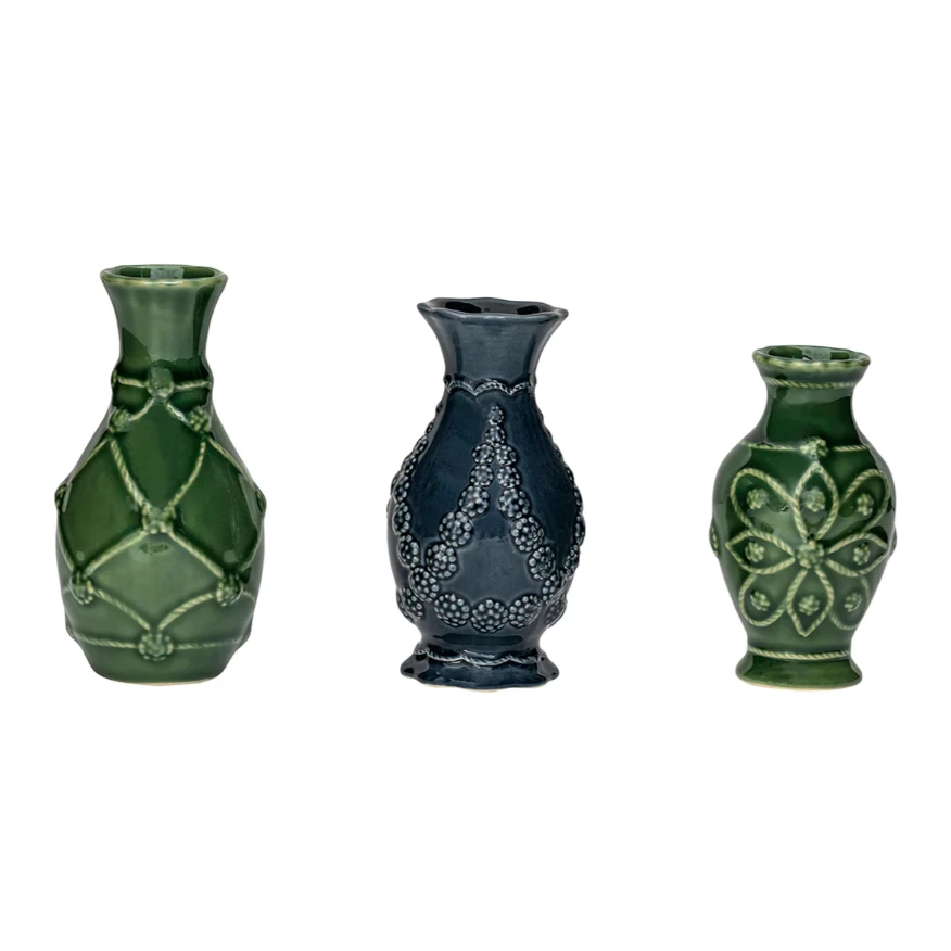 Just the right size for a single stem, this set of three petite ceramic vases are each uniquely adorned with motifs from our Gardens of the World collection. Gift boxed.