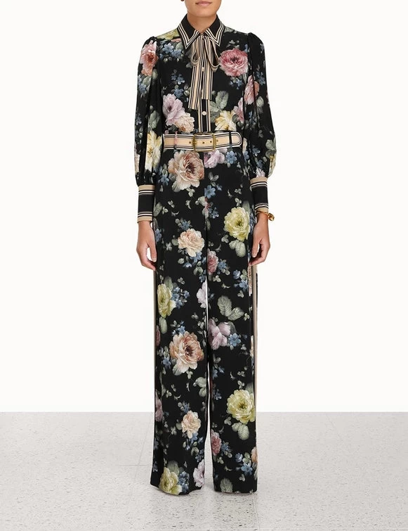 The Luminosity Blouson Shirt in Multi Floral Black from the Fall 2023 Collection, Luminosity. A silk long sleeve blouse featuring french seams and a removable self tie neck tie.